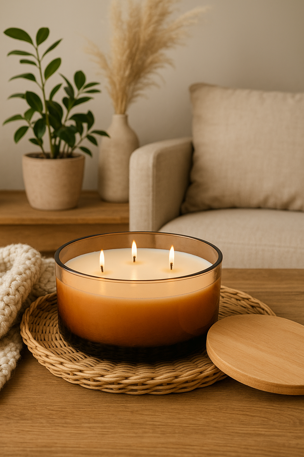 Notre Bougie artisanale en verre ambré clair allie élégance et authenticité.